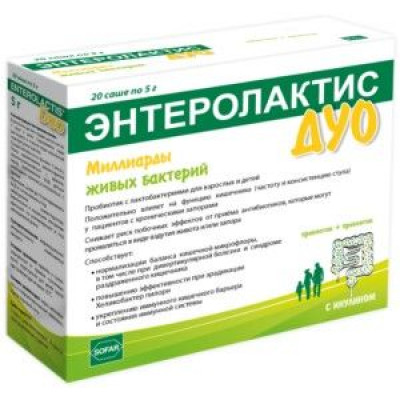 ЭНТЕРОЛАКТИС ДУО - Положительно влияет на функцию кишечника (частоту и консистенцию стула) у пациентов с хроническими запорами. Снижает риск побочных эффектов от приёма антибиотиков, которые могут проявляться в виде вздутия живота и/или запора. Способствует: - нормализации баланса кишечной микрофлоры, в том числе при дивертикулярной болезни и синдроме раздраженного кишечника; - повышению эффективности при эрадикации Хеликобактер пилори; - укреплению иммунного кишечного барьера и состояния иммунной системы.