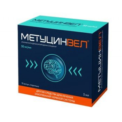Препарат МетуцинВел содержит действующее вещество этилметилгидроксипиридина сукцинат, который при попадании в организм повышает его устойчивость к воздействию различных повреждающих факторов при шоке, недостаточном поступлении кислорода в ткани (гипоксии и ишемии), нарушениях кровообращения в мозге, отравлении алкоголем и антипсихотическими средствами (нейролептиками). Препарат МетуцинВел способен обезвреживать активные формы кислорода (свободные радикалы), образующиеся при перечисленных заболеваниях, тем самым уменьшая повреждения, которые могли бы вызывать гибель клеток в организме. Если улучшение не наступило, или Вы чувствуете ухудшение, необходимо обратиться к врачу.