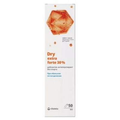 Дезодорант Dry extra forte - дабоматик антиперспирант без спирта на водной основе, позволяет значительно снизить и при регулярном применении нормализовать избыточное потоотделение. Дезодорант обеспечивает эффективную защиту от пота на срок до 5 дней. Является безопасным и эффективным средством при применении согласно инструкции. Сокращение объема потоотделения обеспечивается за счет высокого содержания солей алюминия в составе. В основе действия лежит взаимодействие гексагидрата хлорида алюминия с кожным белком. Благодаря этому регулируется система потоотделения и решается проблема избыточной потливости. При использовании DRY функции потовых желез не нарушаются. В организме происходит равномерное перераспределение выделения пота через другие участки тела. Формула средства обеспечивает безопасность его использования за счет нерастворимости и полного выведения алюминиево-белковых соединений из организма обратно через поры по окончании использования антиперспиранта. Для тяжелой степени гипергидроза (пятно на одежде более 15 см).